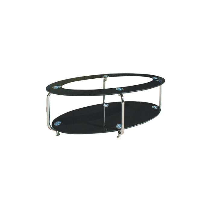 Bàn sofa mặt kính hình elip, sơn trang trí, phần khung sử dụng ống thép mạ Cr-Ni, có đợt kính để đồ.