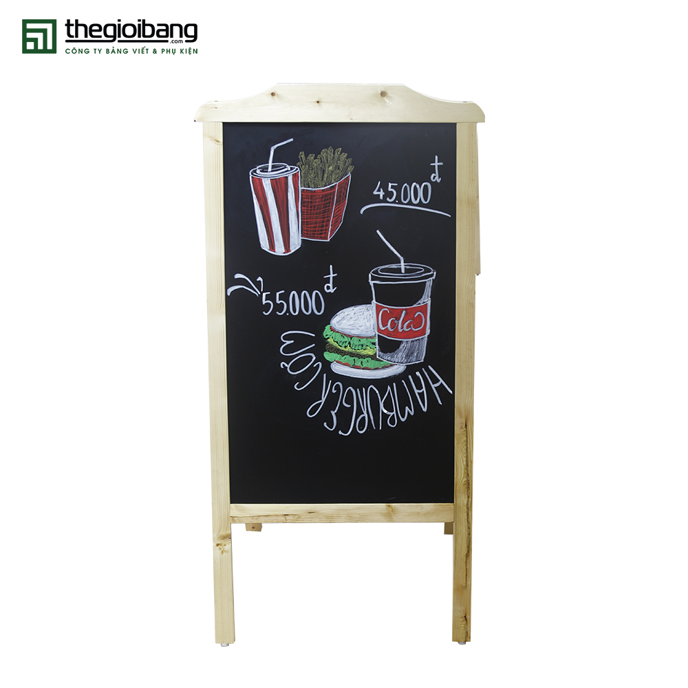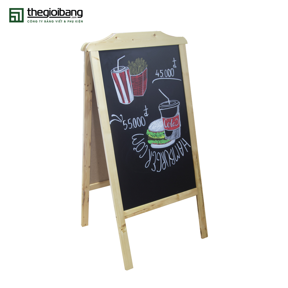 Chiếc bảng menu ITALIA quốc dân mà nhà hàng café nào cũng cần ít nhất 01 cái. Khác với bảng menu treo tường một mặt, bảng Menu chân đứng 2 mặt là sản phẩm có ít nhất 02 bề mặt để trình bày. Chân đứng giúp bảng đứng vững mà không cần giá đỡ thay thanh treo.