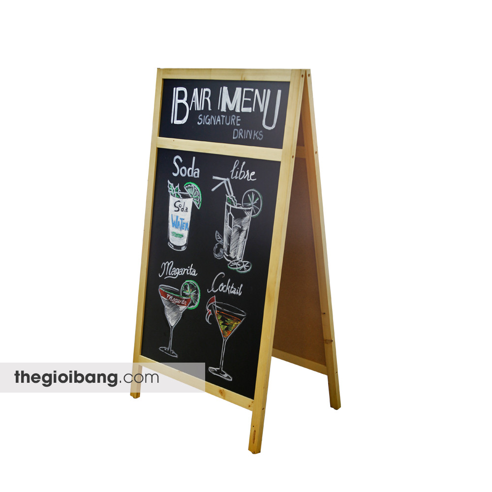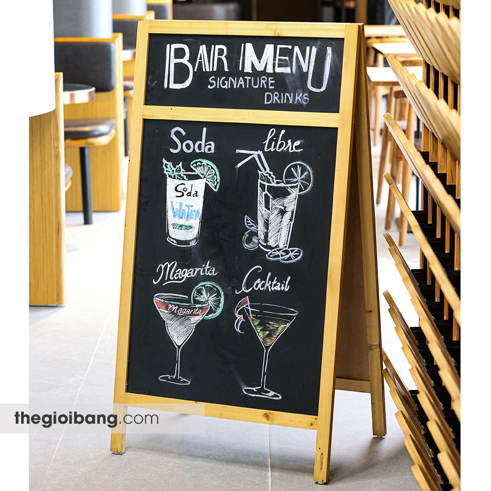 Chiếc Bảng Menu Cavanas là sản phẩm mà nhà hàng café nào cũng cần ít nhất 01 cái. Khác với bảng menu treo tường một mặt, bảng Menu chân đứng 2 mặt là sản phẩm có ít nhất 02 bề mặt để trình bày. Chân đứng giúp bảng đứng vững mà không cần giá đỡ thay thanh treo.