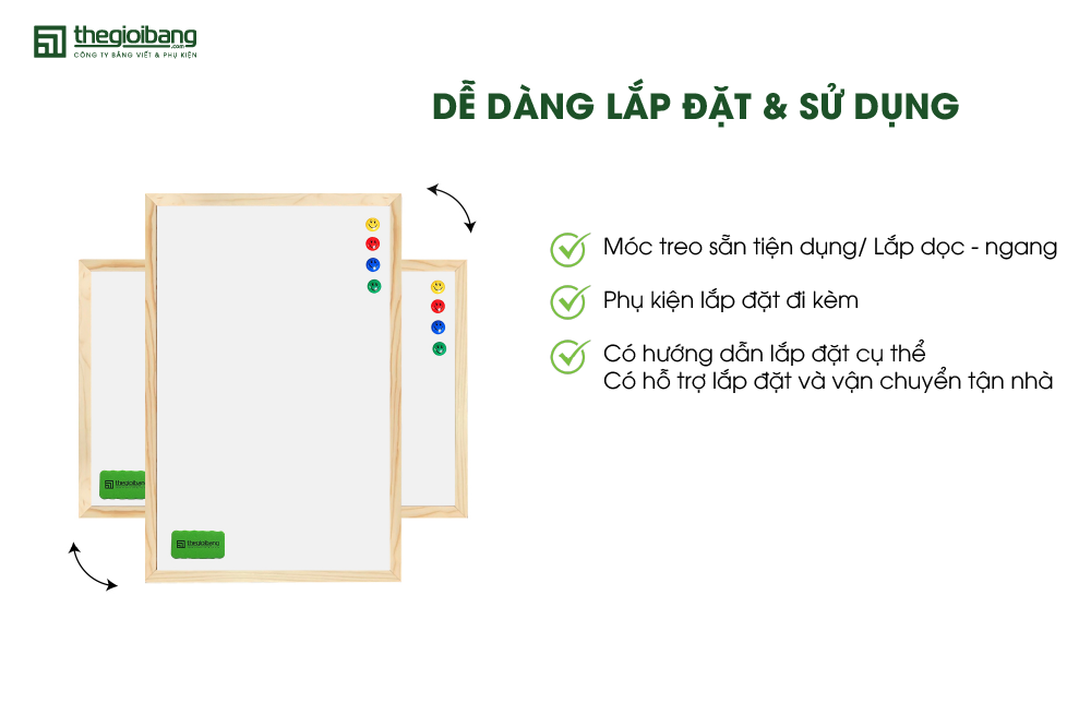 Chỉ với vài thao tác đơn giản trong 5 -10 phút, bảng từ trắng Easyboard đã dễ dàng lắp đặt treo lên tường với đinh và móc treo. Nếu bạn chưa thể lắp đặt, Thế Giới Bảng sẽ có đội ngũ lắp đặt tận nơi cho bạn.