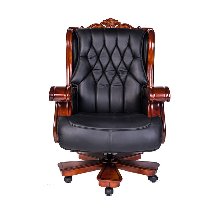 Bề mặt đệm ghế có đường may trang trí. Tay gỗ tự nhiên ốp da 2 tầng. Bát điều chình độ cao cần hơi và độ ngả của ghế.