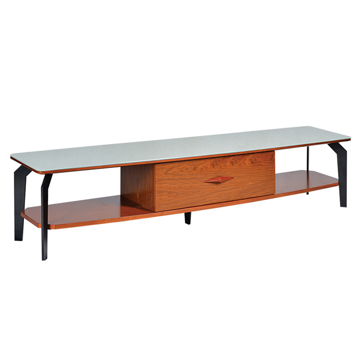 Kệ tivi cao cấp KTV501N7 mặt kính cường lực, khung gỗ công nghiệp phủ veneer óc chó. Chân thép dày 10mm sơn đen nhám. Sản phẩm của nội thất Hòa Phát