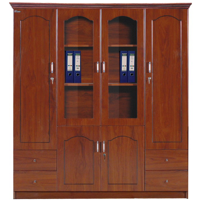 Tủ tài liệu gỗ sơn PU 4 buồng DC1840H1, phía trên gồm 2 khoang cánh kính để tài liệu và 2 khoang treo áo, phía dưới có 4 ngăn kéo và 2 cánh mở