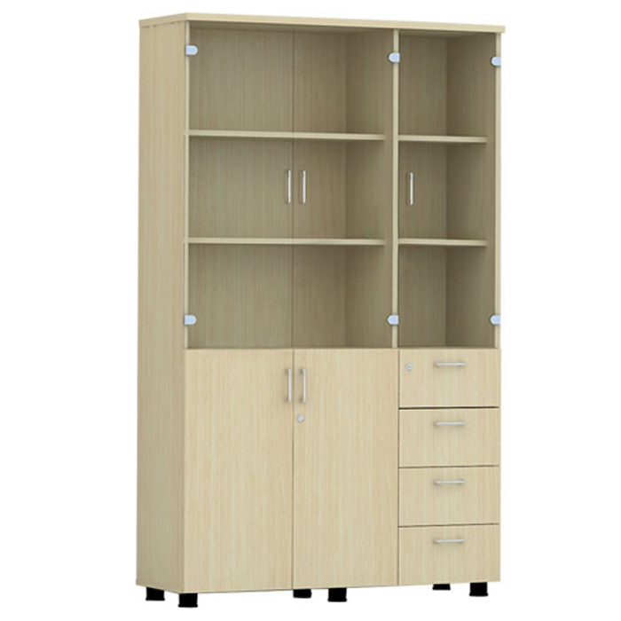 – Tủ 3 Khoang, khoang trên 3 cánh kính, khoang dưới cánh mở gỗ cùng 4 ngăn kéo